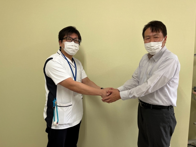 写真は訪問時に撮影させていただきました 福岡徳洲会病院 の 冨永先生 とのお打ち合わせ後の写真です。